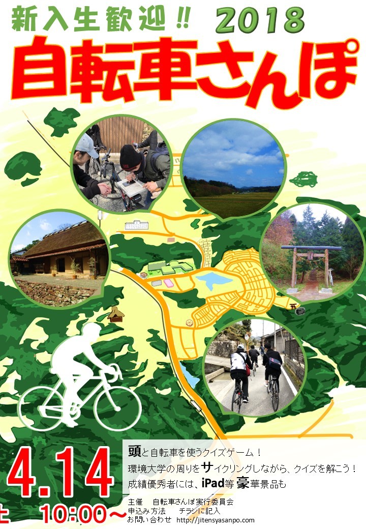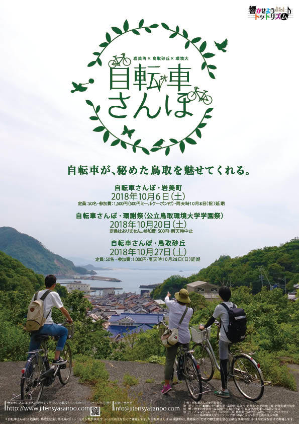 | 2018 | 10月27日(土) 自転車さんぽ in 鳥取砂丘 10月20日(土) 自転車さんぽ in 環謝祭(公立鳥取環境大学学園祭) 10月8日(月祝) 自転車さんぽ in 岩美町 4月14日(土) 公立鳥取環境大学新入生歓迎自転車さんぽ |
